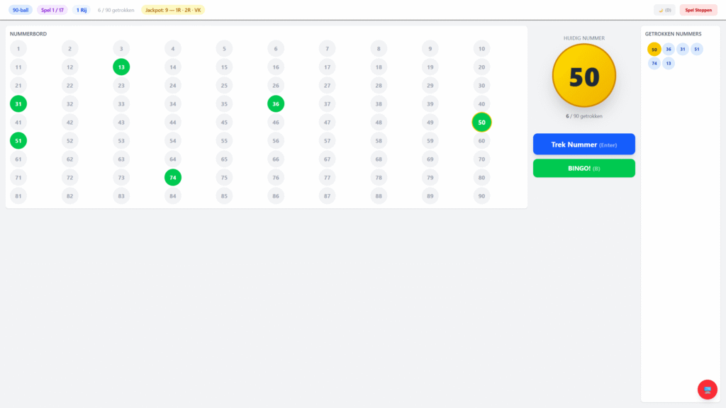 Een overzichtelijke en gebruiksvriendelijke interface waarmee de organisator eenvoudig nummers kan trekken, rondes kan beheren en realtime inzicht heeft in het spelverloop. Hierdoor kan de focus volledig op het evenement liggen in plaats van op handmatige handelingen.