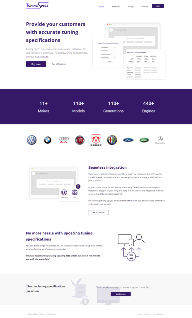 Tuning Specs is een unieke en gebruikersvriendelijke extensie welke gebruikt kan worden voor een website. Tuning Specs kan gebruikt worden door middel van het installeren van een WordPress Plugin of een eigen implementatie op basis van een API.